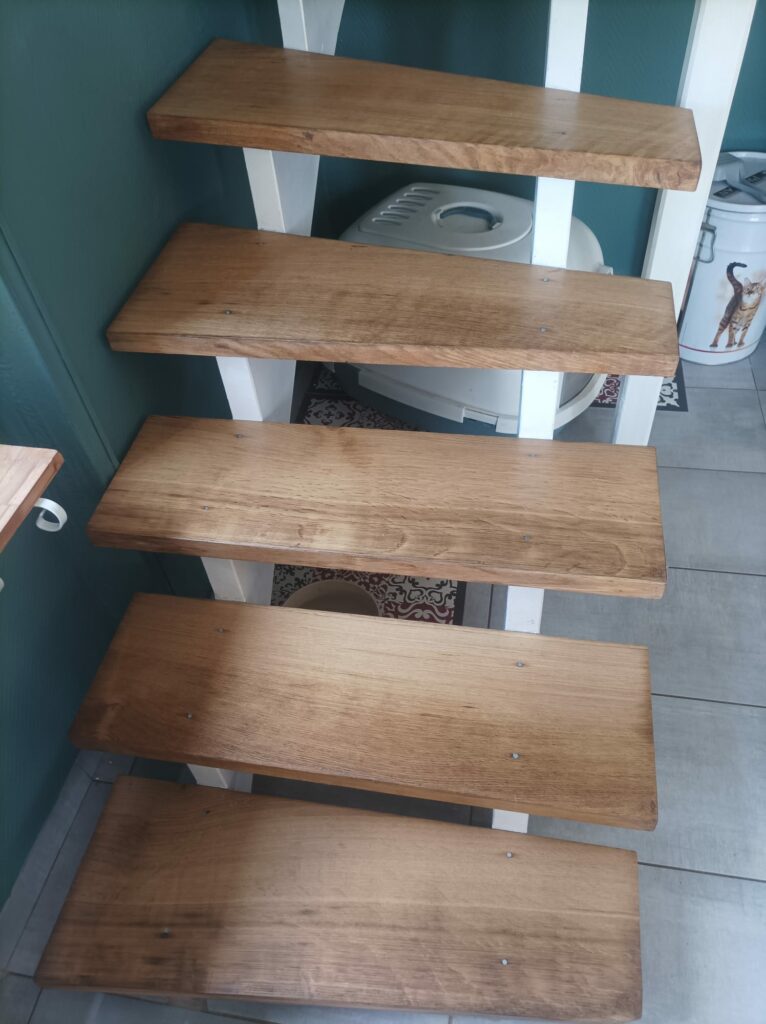 Ponçage complet des marches sur toutes les faces, suivi d’un traitement pour éviter qu’elles ne se foncent avec le temps. Application de plusieurs couches pour prévenir l’usure due aux chaussures, et pour faciliter le nettoyage et le dépoussiérage. La première partie est terminée. La fixation est temporaire afin de pouvoir retirer chaque marche une à une et les transformer en une magnifique création.