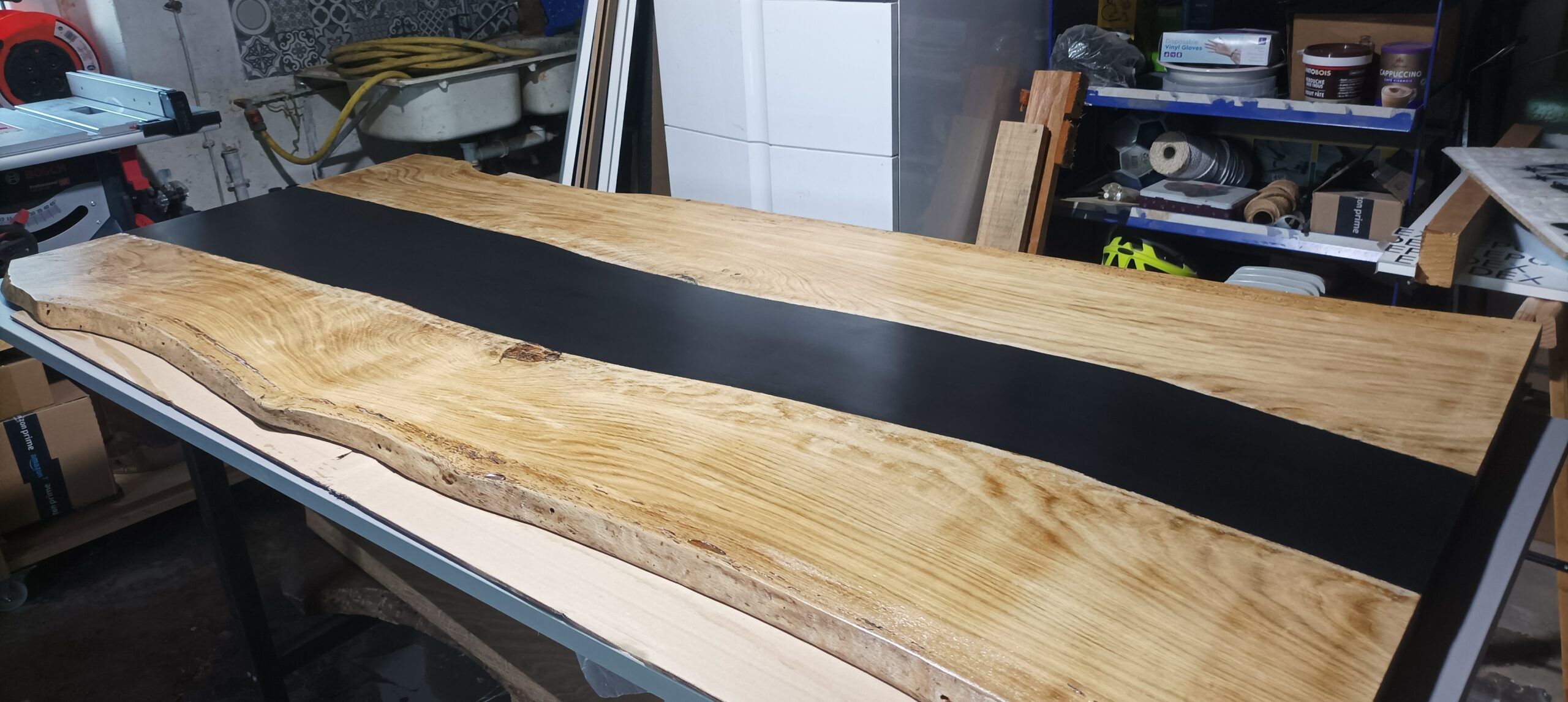 « Superbe table de salon en chêne clair et résine epoxy noir, le pied sera en spider en fer forgé noir. » Signé par le créateur