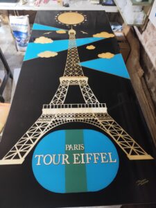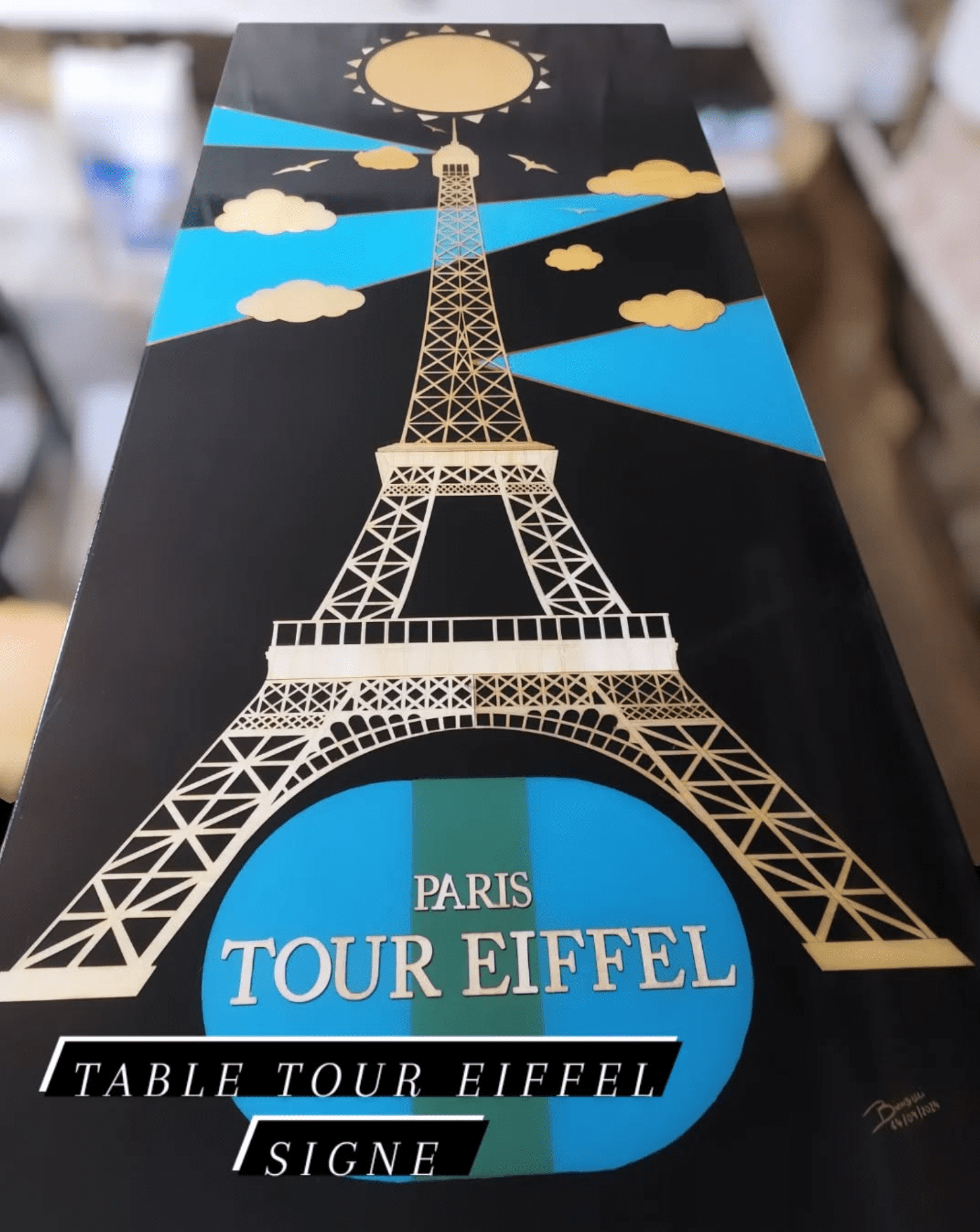« Superbe table de salon design modèle unique, sublimée par une réplique de la Tour Eiffel encapsulée dans de la résine époxy transparente. » Signé par le créateur