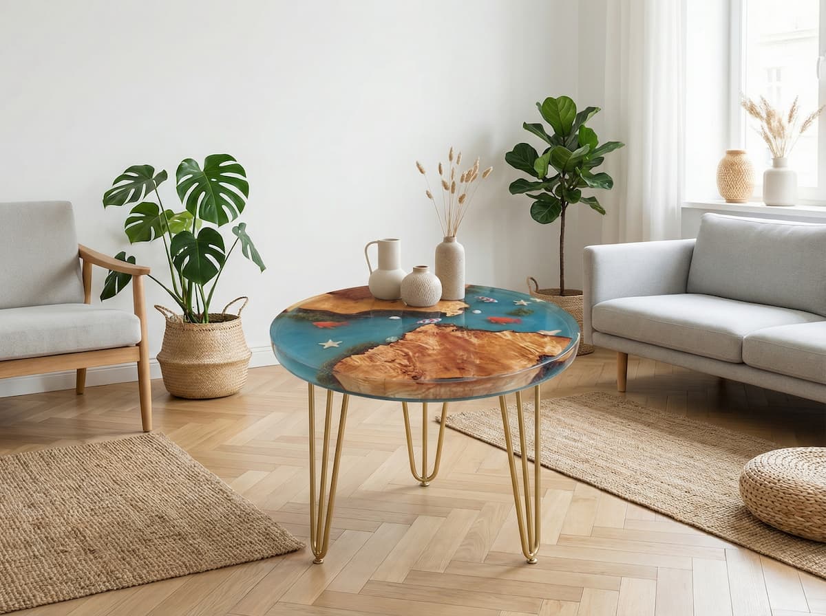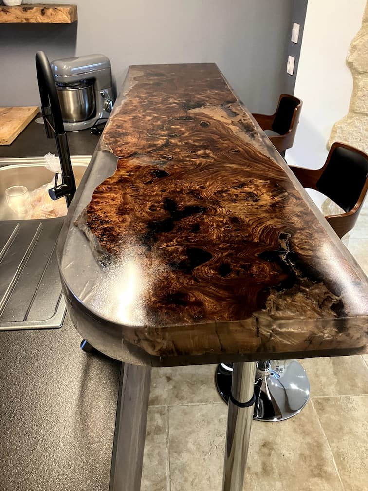 Mariage entre essences de bois nobles et résine époxy. Chaque pièce est une création unique, avec ou sans résine, façonnée pour votre intérieur.